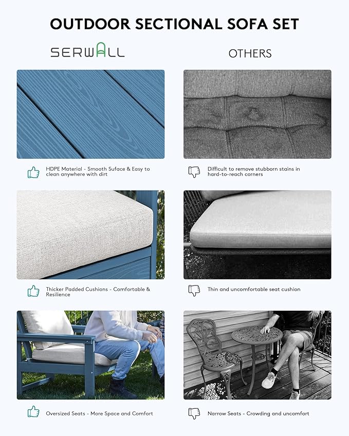 - Exceptional Durability & All Weather: Crafted with HDPE material, this outdoor sectional sofa is built to last, withstanding the test of time and heavy use, each seat can hold up to 360LBS. The weather-resistant HDPE material ensures that this sofa can withstand various weather conditions, making it perfect for outdoor use.
