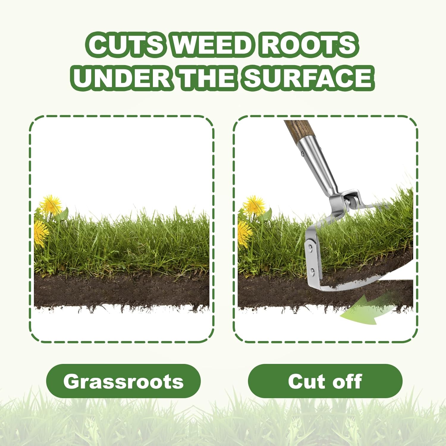 - 【High-Quality Metal Resists Bending】This action hoe is made of thicker stainless steel, which has strong compression and corrosion resistance and is more sturdy and durable, which means it doesn't bend when you are clearing out weeds. The joint uses seamless welding technology to prevent breakage and loosening.