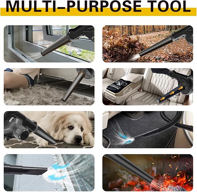- 【2 in 1 blower and vacuum】 In addition to blowing leaves, our cordless blower can also to clean up light snow, dust, computer host and drying your car surface. The small leaf blower storage bag use thicker material to prevent dust from flying.