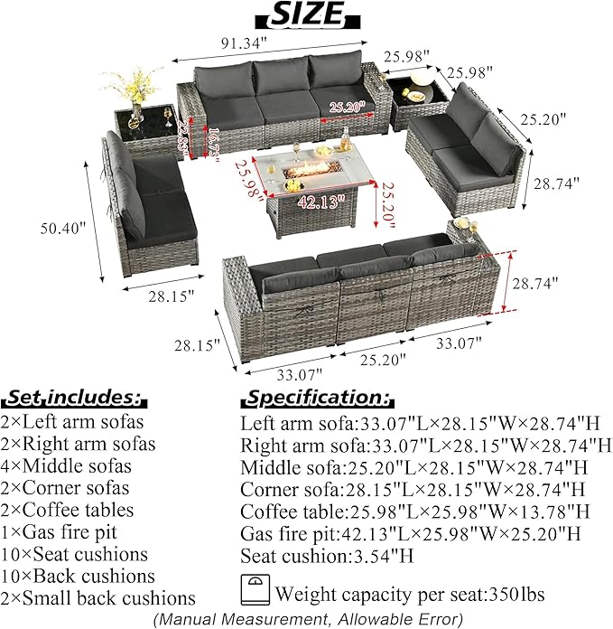 - Sectional Design: Comes with 1 firepit table,4 single arm chairs, 4 middle chairs, 2 corner chair and 2 tempered glass top coffee table. With chair connecting clips to lock the chairs together if need be. Modular design enables to make the patio set in any shape you like to fit your needs