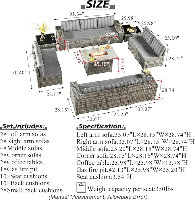 - Sectional Design: Comes with 1 firepit table,4 single arm chairs, 4 middle chairs, 2 corner chair and 2 tempered glass top coffee table. With chair connecting clips to lock the chairs together if need be. Modular design enables to make the patio set in any shape you like to fit your needs