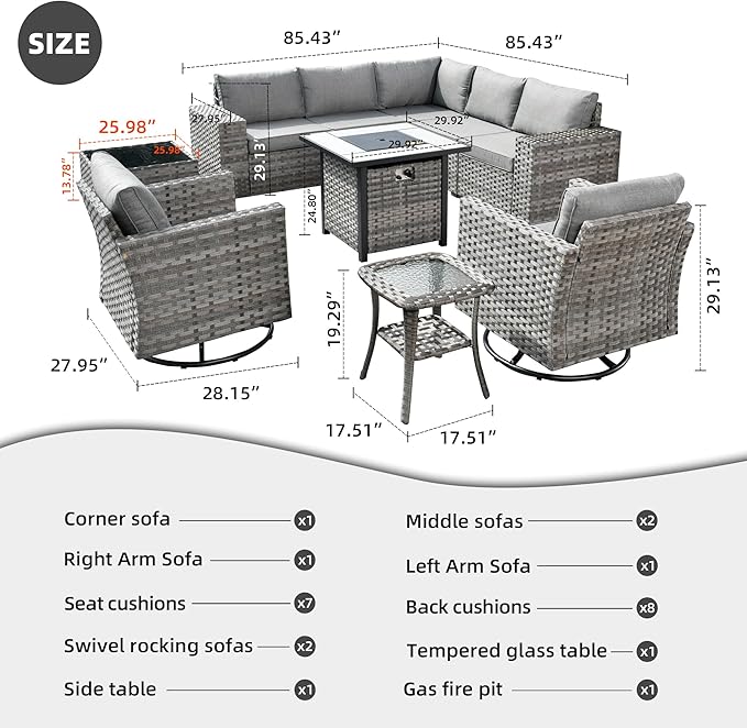 - Sectional Design: Comes with 1 firepit table,2 swivel rocker,2 single arm chairs, 2 middle chairs, 1 corner chair 1 double layer side table and 1 tempered glass top coffee table. With chair connecting clips to lock the chairs together if need be. Modular design enables to make the patio set in any shape you like to fit your needs