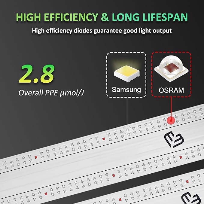 - ☀ Our new LED plant grow lights have a powerful light output and uniform canopy penetration with better light absorption by plants. It uses the high-efficiency LED plant light technology and premium Samsung LM301B diodes, which deliver an overall PPE of 2.8 μmol/j and the energy consumption is only 300 watts, providing you the excellent choice for you with cost-effective.