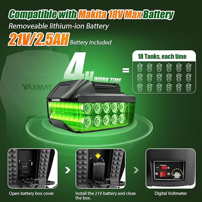 - Designed for Makita Compatibility: Our backpack garden sprayer seamlessly is compatible with Makita 18V Lithium-ion batteries, ensuring easy battery replacement whenever needed. Additionally, we provide a 2.5Ah 21V battery and charger for continuous power, providing uninterrupted power to fuel your gardening endeavors.