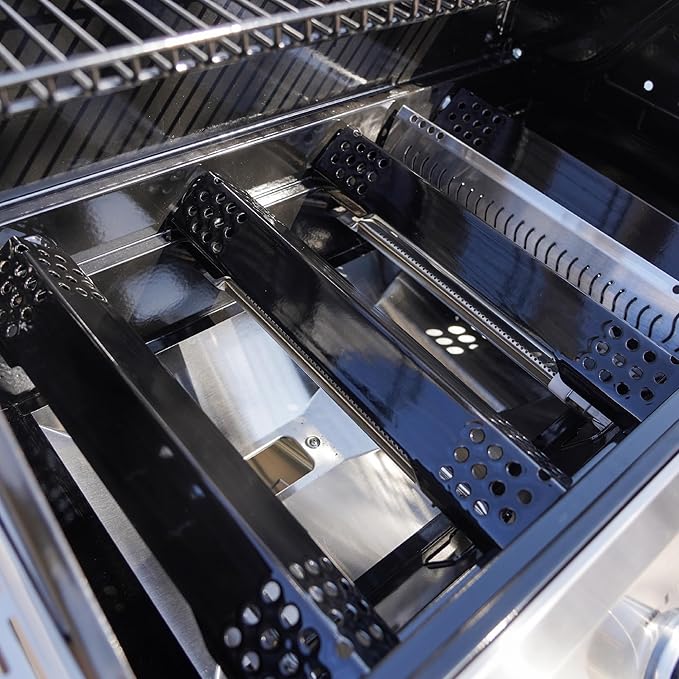 - ADVANCED SEAR-REACH UP TO 650F° In 10 MINUTES: Unlike conventional burners with side flame holes, this sear zone showcases U-shaped fire holes at the front, ensuring a more efficient fire output. The flame tamer above, featuring smaller angles and V-shaped flame holes densely distributed on both sides, effectively reduces bothersome hot spots on the grill surface.