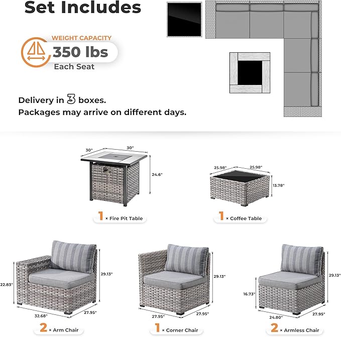 ovios 7 Pieces Patio Furniture Set, Outdoor Wicker Sectional Sofa with 30 Inch Fire Pit Table Comfy Cushions, Modern Modular Deep Seat Rattan Couch Conversation Set, Dark Gray Stripe