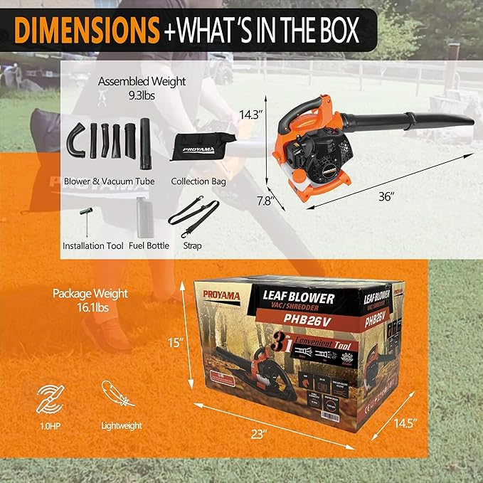PROYAMA Gas Powered Leaf Blower, 3-in-1 26cc 2-Cycle Handheld Leaf Blower & Leaf Vacuum Mulcher, 412 CFM 200 MPH Cordless Blower with 10 Gallon Collection Bag for Lawn Yard Blowing Snow Dust Debris
