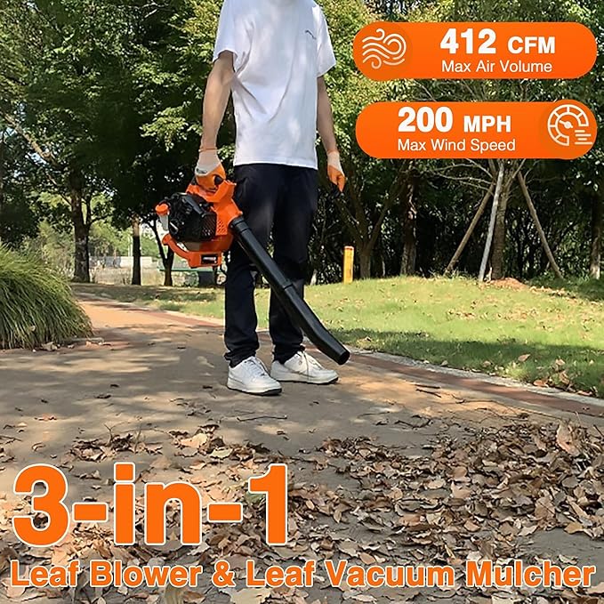 - 3-in-1 Leaf Blower & Leaf Vacuum: With an air volume & air speed up to 412 CFM/200 MPH, you will be able to clear leaves & other debris from yards, sidewalks, driveways, vacuum 10 gallon capacity bag for collecting leaves. Grind up to 16 bags of leaves down to 1