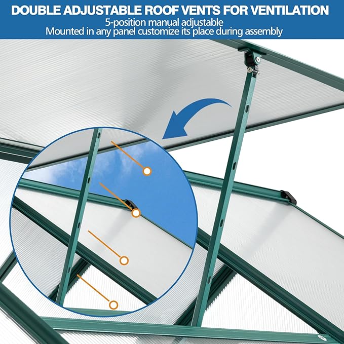 - 【Heavy-duty & Durable Frame】The 4mm thick polycarbonate board can withstand outdoor temperature from -20℃ to 70 ℃, allowing enough sunlight to pass through and isolating most UV rays. The aluminum alloy frame with powder coating is more durable, won’t get rust.The panels allow up to 70% light transmission for optimal plant growth while blocking out over 99.9% of harmful UV rays.