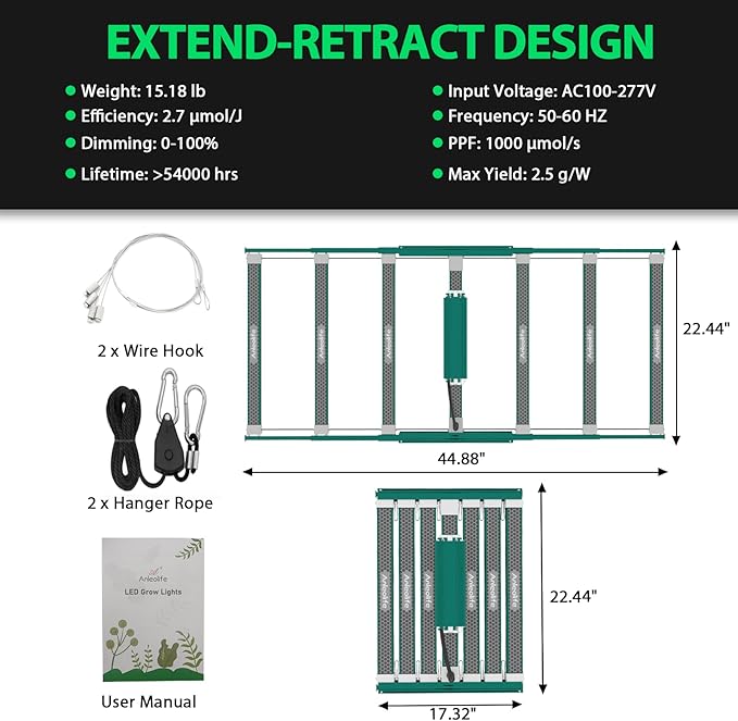 - Unique Extend-retract Design: Freely adjustable light bar spacing to suit different plant growth stages. Bar structure is lightweight, easy to install, plug and play