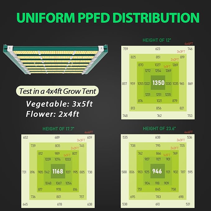 - High Efficiency & High Yeild: 1050pcs LM301H EVO and LM281B+Pro LEDs, market-leading 2.7 µmol/J PPE, Max yield 2.5 g/W, achieving an impressive PPFD 1350 μmol/m²/s at 3x5ft core coverage. Compared with other similar lamps, the yield is increased by 20%, the average PPFD is increased by 20%, and the energy consumption is reduced by 10%