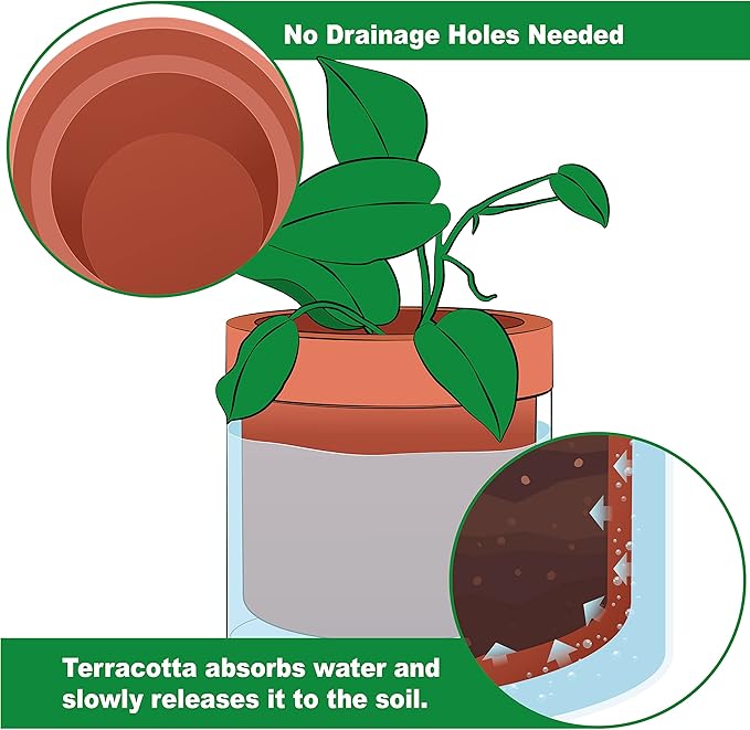 - Self-watering System: The terracotta pot is unglazed, just fill the glass container with water to ensure plants will absorb only what they need through the terracotta pot walls.
