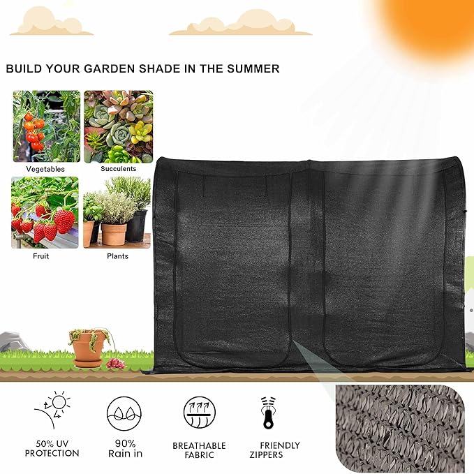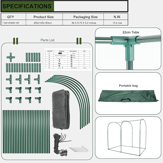 - Large size and portable packaging - Large Size & Portable Packaging-length 250cm,width 125cm and height 185cm / 98.4x49x72inches and each tunnel sunshade net weight has 13lbs ,the garden netting cover can be put in 90cm carry bag and it is very portable