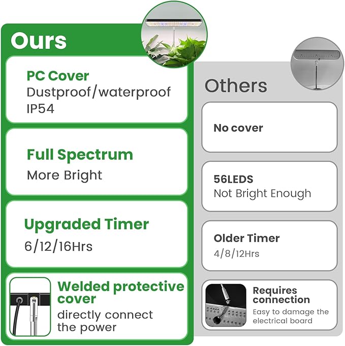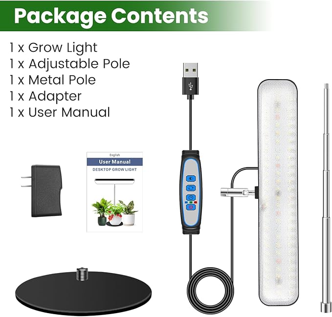 - Upgraded Desk Grow Light: This grow lamp is equipped with PC cover, and a protective sleeve is welded to the lamp board interface. Not only is it dustproof, it also provides safe lighting protection. 5.2 inch metal base and anti-slip pads ensure stability.