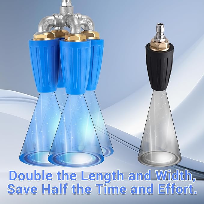 - 【Innovative Upgrade】Quadruple pressure washer turbo nozzle adds a row of dual turbo nozzle on the basis of the dual nozzle, and the spray range is four times that of the single rotating pressure washer nozzle, greatly increasing the spray range and water flow. With a powerful flow of water, 4-in-1 power washer turbo nozzle can quickly and effectively remove stubborn stains on a variety of surfaces, making it the ideal and reliable choice for your cleaning job.