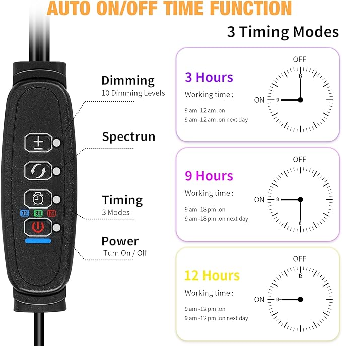 - 【Timing Function】 : zyzykeji grow lights have cyclic memory timing function, the product will automatically open and close, you can set 3 hours, 6 hours, 12 hours, do not need manual operation, can take better care of the plant.