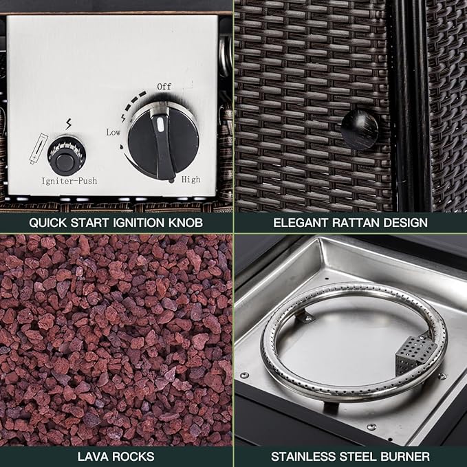 - [Beautiful Design]This propane fire pit table made from black-finished iron and has a flared pedestal base that's with wicker side plates for an old elegant look. It's suitable for most patio furniture and make your yard more comfort.