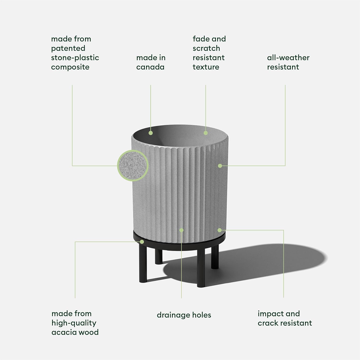 - Material : Plastic-stone composite planter & Acaia wood stand