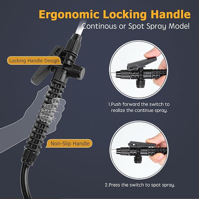 - Locking Handheld: The handle can be locked for continuous spraying effortlessly. The 48-inch hose and 22-inch long wand extend your spraying range, ensuring that we can carry out a full spray.