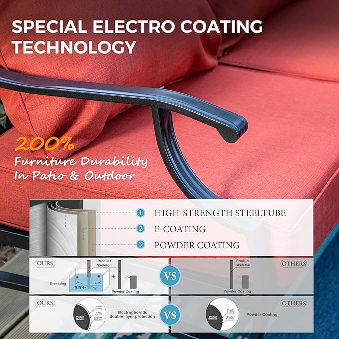 - 【RELIABLE ALL-WEATHER METAL CONSTRUCTION】Built from durable metal with E-COATING and POWDER-COATING finish, ensuring resistance to all weather conditions, rust-proof qualities, and easy maintenance. The sturdy wrought iron frame can withstand various weather conditions, with the single chairs supporting up to 350 lbs and the 3-seater sofa accommodating up to 900 lbs, promising long-lasting reliability and durability