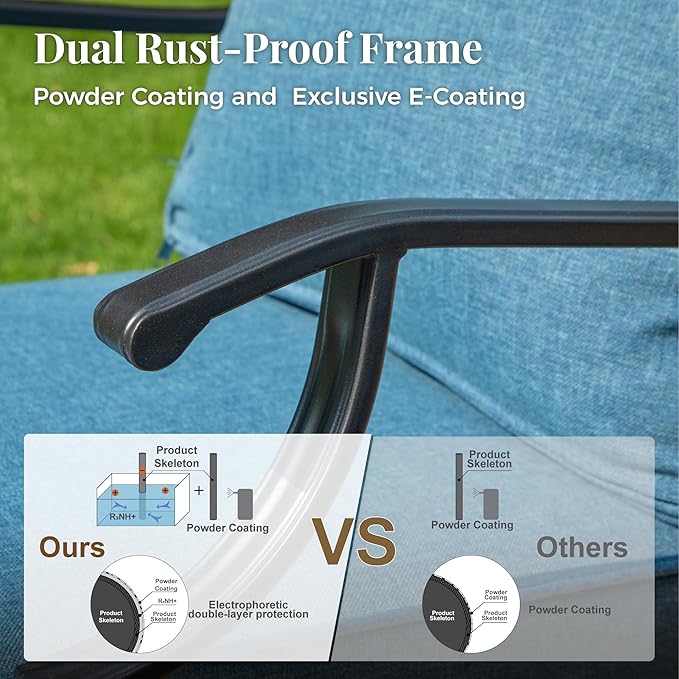 - 【RELIABLE ALL-WEATHER METAL CONSTRUCTION】Built from durable metal with E-COATING and POWDER-COATING finish, ensuring resistance to all weather conditions, rust-proof qualities, and easy maintenance. The sturdy wrought iron frame can withstand various weather conditions, with the single chairs supporting up to 350 lbs and the 3-seater sofa accommodating up to 900 lbs, promising long-lasting reliability and durability