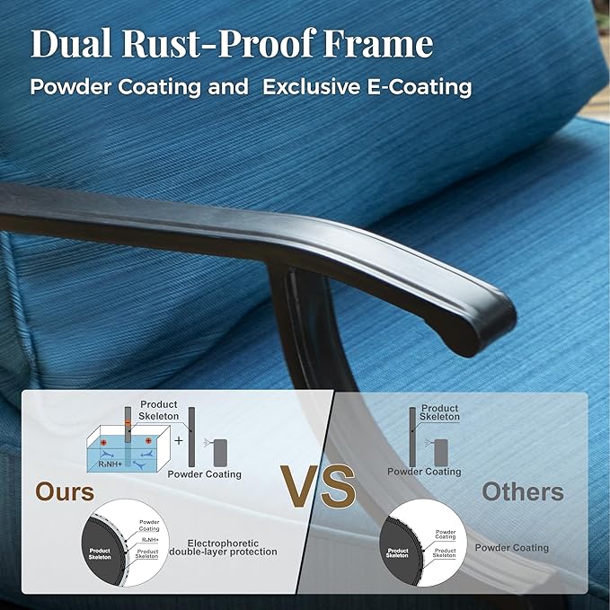- 【RELIABLE ALL-WEATHER METAL CONSTRUCTION】Built from durable metal with E-COATING and POWDER-COATING finish, ensuring resistance to all weather conditions, rust-proof qualities, and easy maintenance. The sturdy wrought iron frame can withstand various weather conditions, with the single chairs supporting up to 350 lbs and the 3-seater sofa accommodating up to 900 lbs, promising long-lasting reliability and durability