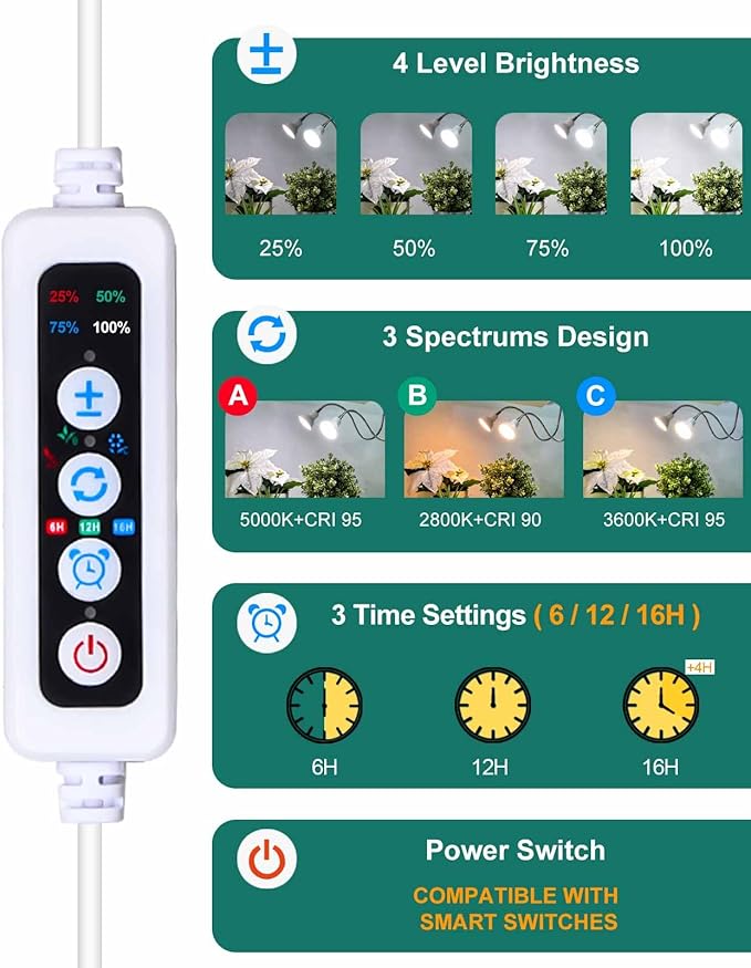 - Auto Timer: The timer of led grow lights for indoor plants is a more precise program built by our professional engineers. With the 24h-cycle function of plant grow light that simulates daily sunlight, you won't have to worry about plant development when on a business trip or vacation