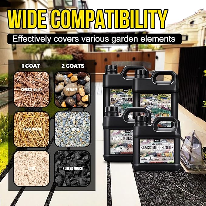 - UPGRADED 2-IN-1 FORMULA - Our upgraded 2-in-one black mulch glue seamlessly combines adhesive and color, not only delivering 10x stronger adhesion but also giving your mulch a fresh, new look. It keeps mulch, wood chips, shells, sand, pine grass, small pebbles, hay and straw, small gravel, and leaf piles securely in place. You can effortlessly create beautiful and long-lasting outdoor spaces.