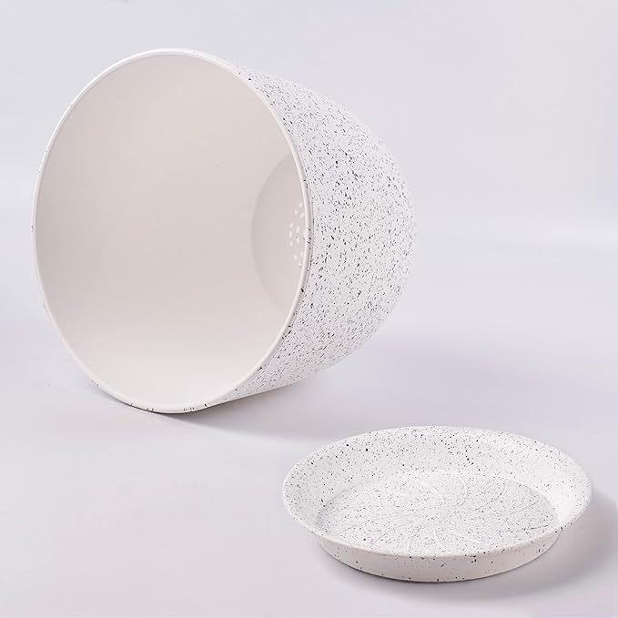 Giraffe Creation 12/10/9 Set of 3 Speckled White Plant Pots, Modern Indoor & Outdoor Planters with Drainage Holes and Saucers