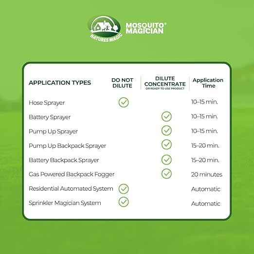 - EXTENSIVE COVERAGE & EASY APPLICATION – Mosquito Magician provides an effective solution for treating large outdoor areas. Simply mix 6 ounces of concentrate with 1 gallon of water to create a ready-to-use mosquito yard spray. Apply with a pump sprayer, backpack sprayer, fogger, or use with Sprinkler Magician automated Smart Yard Systems. One gallon treats up to 128,000 square feet, offering extensive mosquito repellent coverage for your entire property.
