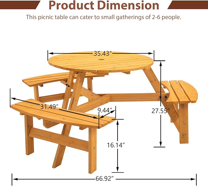 - 【Build-in Benches】The wooden table is equipped with 3 curved benches that can accommodate 6 people easily and comfortably. Additionally, there is sufficient legroom between the benches to ensure optimal comfort for all.