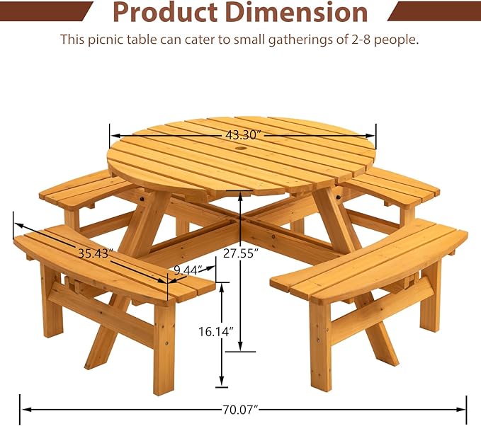 - 【Build-in Benches】The wooden table is equipped with 4 curved benches that can accommodate 8 people easily and comfortably. Additionally, there is sufficient legroom between the benches to ensure optimal comfort for all.