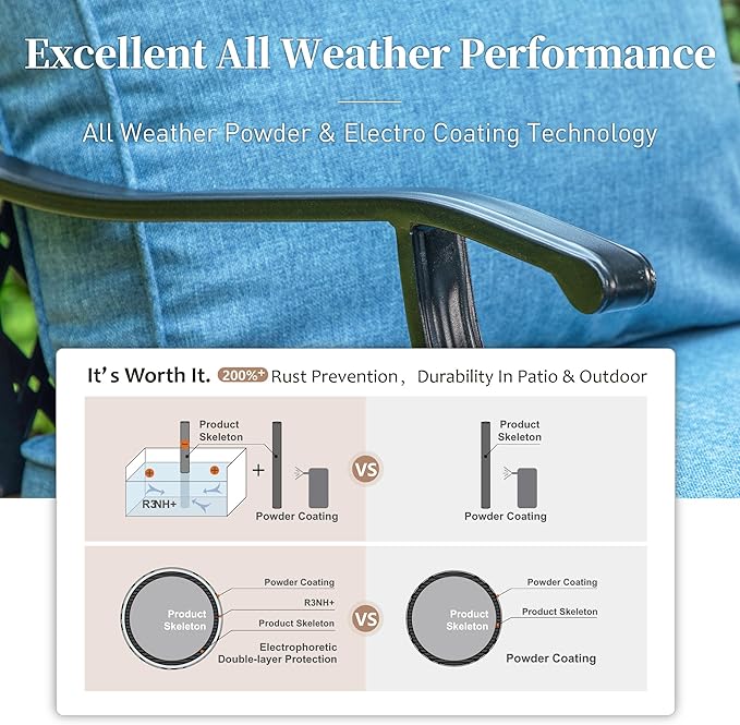 - ALL WEATHER HEAVY-DUTY FRAME: This metal backyard furniture set is made of high-performance E-COATING and POWDER-COATING dual rust prevention techniques that are All weather resistant, anti-rust, and easy to clean, with no special care needed. That patio conversation set has a heavy-duty wrought iron metal frame, The single chairs could support up to 350 lbs weight
