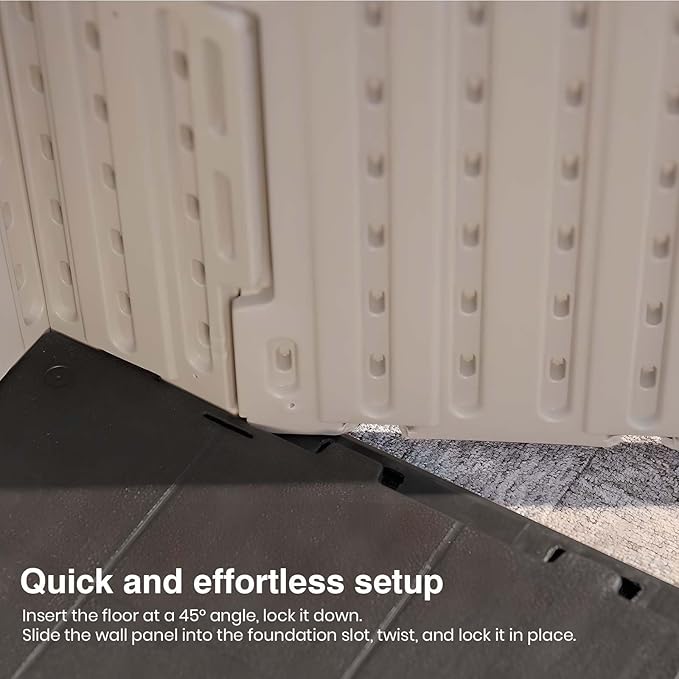 - Easy "Kick-it" Installation: This shed reduces the number of screws by 35%, making assembly faster and simpler. Whether you're a DIY novice or not, our innovative 'kick-in' assembly method ensures that setting up your shed is a breeze.