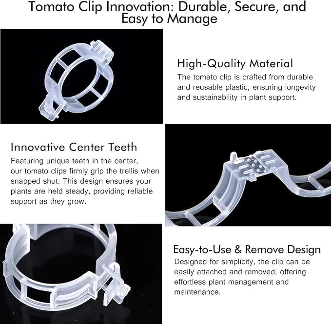 - Durable Plastic Plant Support Clips: Crafted from durable plastic, these white tomato clips are designed for reuse, reducing waste and promoting sustainable gardening practices. Easy to install and remove, plastic plant clips can be reused season after season.