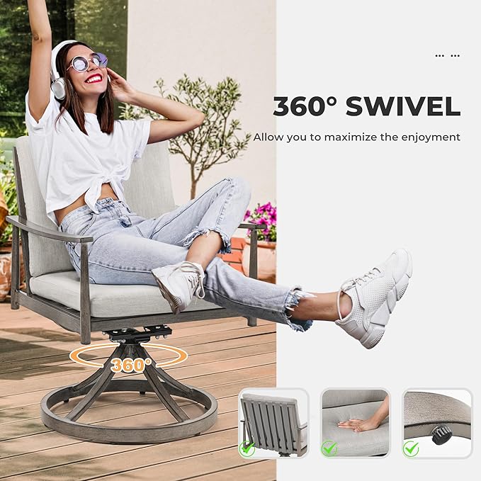 HAPPATIO 5-Piece Outdoor Dining Set for 4, Aluminum Patio Dining Set Includes 1 Large Square Table with Umbrella Hole, 2 Swivel Dining Chairs, and 2 Dining Chairs, for Lawn, Porch, Backyard (Grey)