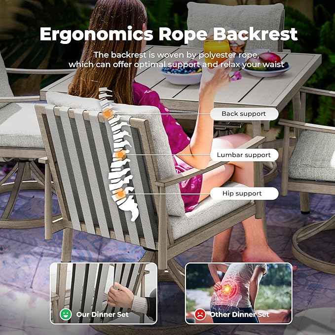 - Unique Backrest with Rope Design: The backrest of each patio dining chair is wrapped with polyester woven rope that provides comfortable and elastic support. With its excellent color retention, it can withstand various outdoor conditions and weather.