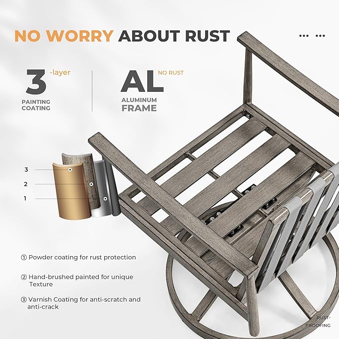 - Powder-Coated Aluminum Frame: Our outdoor patio dining set features an all-aluminum frame that is incredibly durable with its powder-coated surface. These features guarantee maximum stability and protection from rust and rain damage. Each chair can support up to 250 LBS. Furthermore, the frame surfaces are meticulously hand-brushed by skilled craftsmen, creating a unique texture that adds an elegant touch to your dining area.