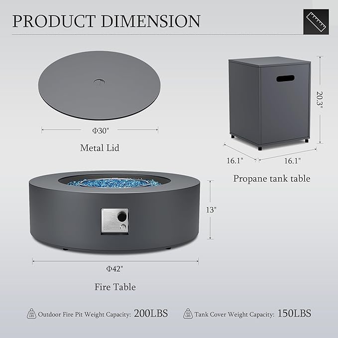 - 【Package Contents】The propane fire pit is delivered in one box and comes with fire pit 1pc, propane tank cover 1pc, rain cover 1pc, detachable burner lid 1pc, propane hose 1pc, glass rocks 1bag and user manual 1pc. Please note that the propane tank cover is located on the bottom of the fire pit table, If you have any questions or need assistance, please contact our customer service team