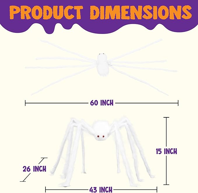 - Creepy Realistic Halloween Decor: Our Halloween White Hairy Spider boasts a spine-chillingly realistic design and is covered with soft plush, The overall length of the spider when laid flat is 5ft(When the spider is standing, the height from base to top is 15 inches, the depth from front to back is 26 inches, and the width is 43 inches)
