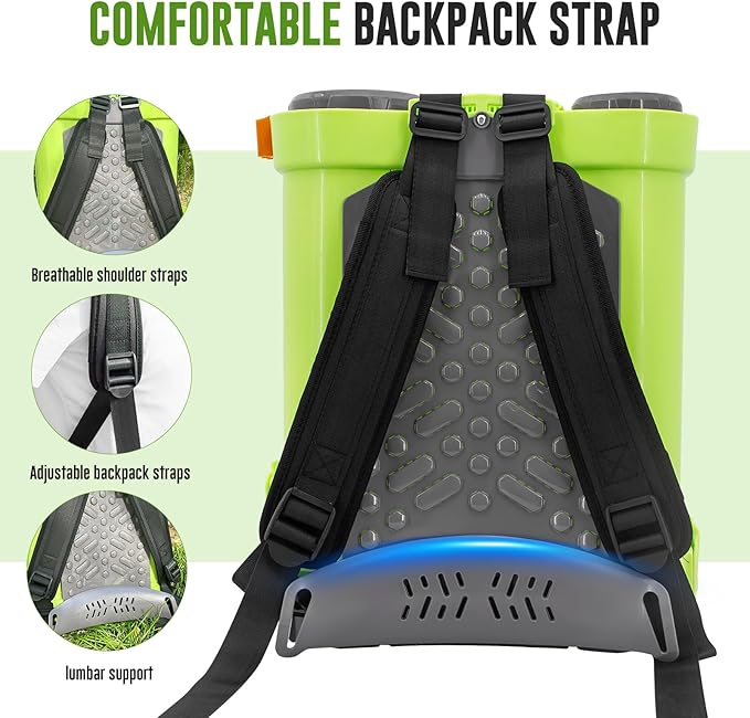 - Comfortable Backpack Sprayer: The thickened and widened backpack strap of lawn sprayer guarantees easy mobility and utmost comfort. With Unique Waist Support and thickened cushioning design, it minimizes strain and fatigue, allowing for effortless spraying while carrying the sprayer. The translucent water tank scale allows for easy monitoring of the remaining liquid level. Additionally, our battery powered sprayer boasts an upgraded storage area to accommodate essential accessories with ease.