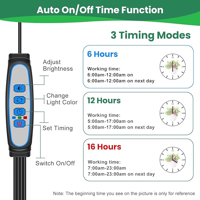 - [Auto On or Off & Precise Timer] The plant light with automatic memory timing function can be automatically turned on/off every day according to your settings (6H 12H 16H) requires no manual operation. The grow light will be convenient to take good care of your plants when you go out to work or on vacation