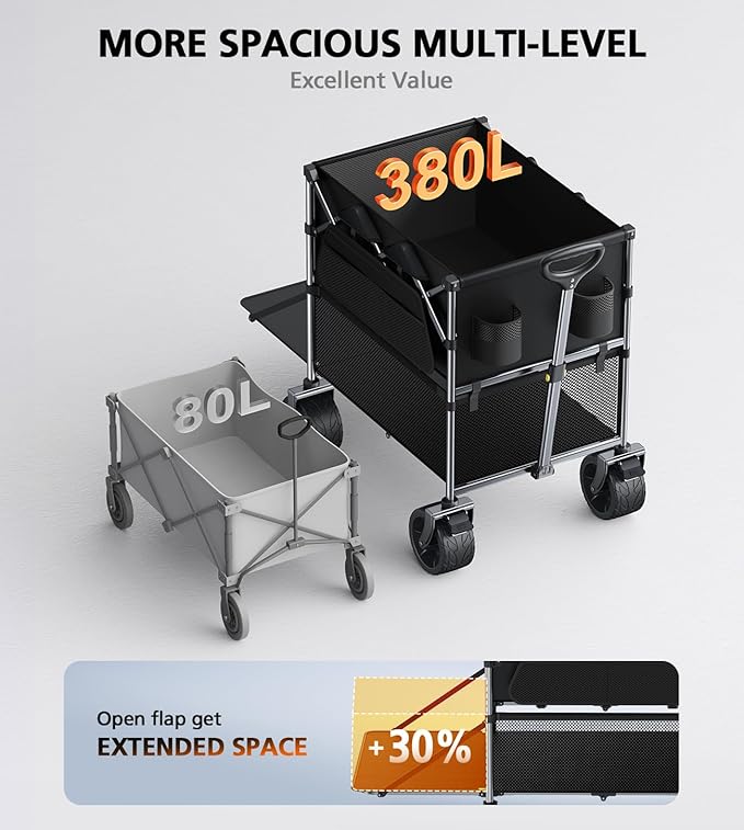 - Extended Shelf of All Terrain Wagon. Heavy duty wagon comes with an extended lower shelf that measures 44.5 inchs in length, perfect for longer, oversized items. Equipped with side pockets, dust bag and 2 cup holders for snacks, books, water, drinks, etc. So perfect outdoor camping cart, family shopping cart, garden cart, grocery cart, fishing cart.