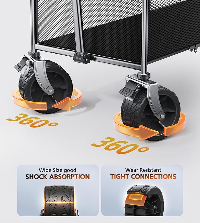 - All-terrain Off-road Carts Wheels. The premium beach carts with wheels for all ground are strong abrasion resistance, silent shock absorber, wear-proof, no drag marks. It can walk all terrains- concrete, grass, rock, mud. Handles like a dream on hills too.