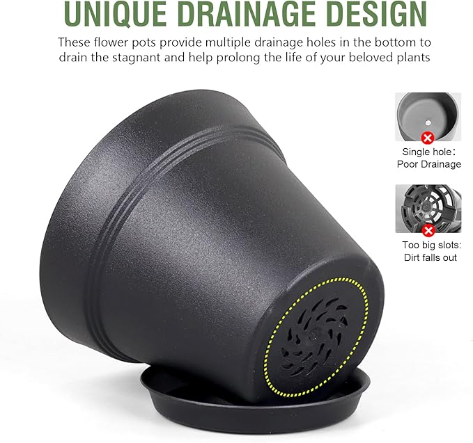 - 【Drainage Holes and Trays】Each plant pot features well-designed drainage holes at the bottom to ensure proper water flow. Additionally, saucers catch excess water, keeping your growing area clean and tidy while also ensuring that your plants remain hydrated without becoming waterlogged.