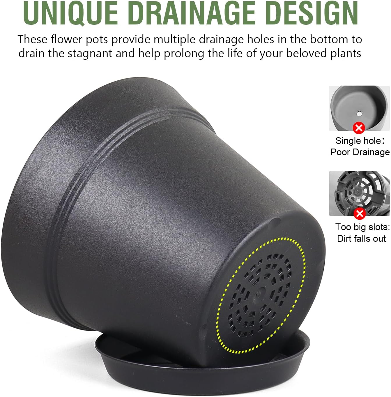 6 inch Nursery Pots, 16 Pack Plastic Plant Pots for Indoor Outdoor Plants, Flower Pots with Drainage Holes and Saucers, Decorative Seedling Starter Planters for House Plants, Black