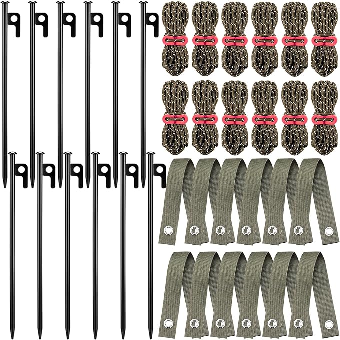 - Complete Stump Kit: our tree staking kit includes 12 pieces of tree support straps, 12 stakes and 12 ropes for anchorage; The improved rope has been cut into 3 sections for easy use and equipped with an aluminum adjuster for quick installation; The ring of straps is made of copper, which is durable and rust proof