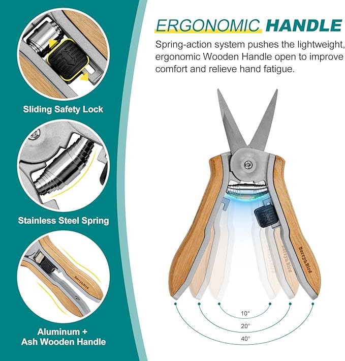 - Reduce Hand Strain: The pruning shears have a built-in high-resilient steel spring, which opens automatically and is easy to work. The ergonomically designed ash wooden handle fits the curvature of the palm better, and is soft and non-slip, making you feel more comfortable. The overall scissors have good impact resistance, which can effectively buffer the vibration generated by pruning and reduce hand fatigue during use.