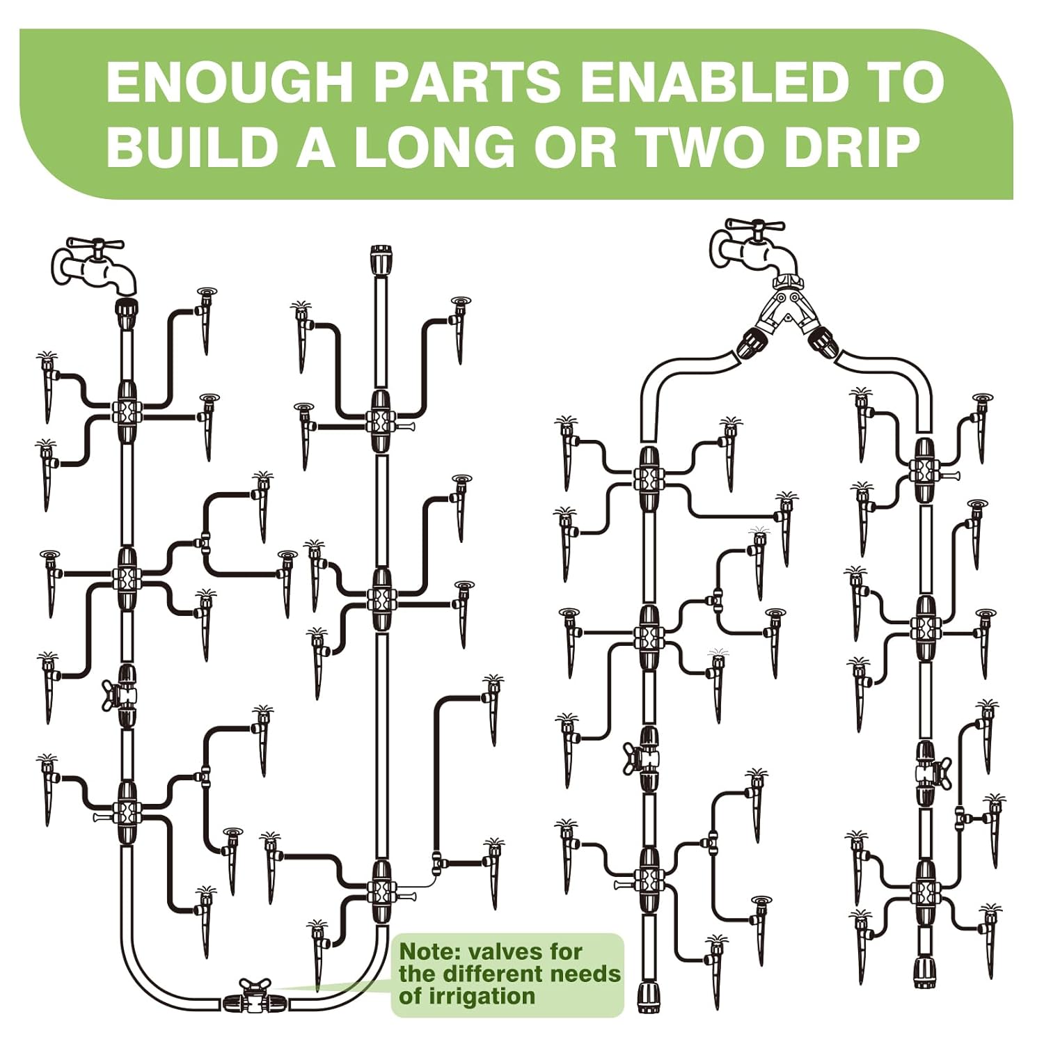 - Enhanced Tubing Design: Our main tubing has been upgraded to withstand higher water pressure, ensuring durability and reliability. With a generous 40FT length, which can be easily divided into two main tubes, and two faucet connectors included, setting up multiple drip irrigation systems is a breeze.