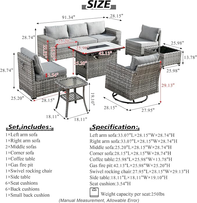 - Sectional Design: Comes with 1 firepit table,1 swivel rocker,2 single arm chairs, 2 middle chairs, 1 corner chair 1 double layer side table and 1 tempered glass top coffee table. With chair connecting clips to lock the chairs together if need be. Modular design enables to make the patio set in any shape you like to fit your needs